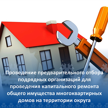 Уведомляем о начале проведения предварительного отбора подрядных организаций для проведения капитального ремонта общего имущества многоквартирных домов на территории округа